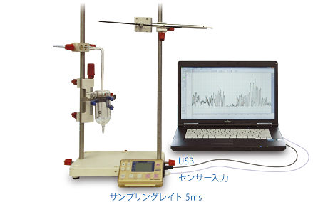 アンプ、センサー、測定スタンド、パソコンで構成され、アンプ出力はUSBで直接パソコンへ入力できます。